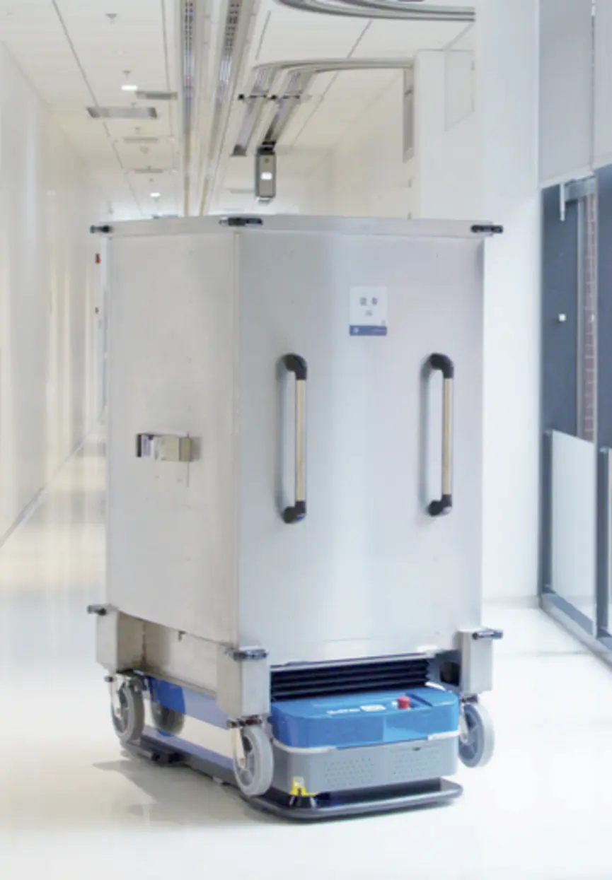 These automated delivery trolleys are available in two standard chassis types, depending on the desired payload and transport speed. Additionally, various attachments are available to transport a wide range of items, including medications, laboratory samples, IV fluids, sterile supplies, documents, and other media.